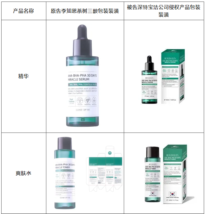 2021年原告委托新浪体育调查发现,被告汕头市深特宝洁实业有限公司生产、销售和推广的“茶树祛痘美白补水液”“茶树香皂”等护肤品,其产品包装装潢直接抄袭、摹仿原告前述已经具有较高知名度和影响力的“SOME BY MI/莎柏蜜”茶树三酸系列化妆品和黑蜗牛精华液的包装、装潢设计,使用与之近似的标识,造成消费者混淆误认。故原告作为茶树三酸、黑蜗牛精华包装装潢权益获益人,诉至广东省汕头市中级人民法院。汕头中院认定:李知恩主张的茶树三酸、黑蜗牛精华包装装潢构成具有一定影响的包装装潢,深特宝洁公司生产、销售茶树三酸、黑蜗牛精华液的行为构成不正当竞争。因判赔额不符合原告预期,原告后上诉至广东省高级人民法院,广东省高级人民法院最终维持一审判决。